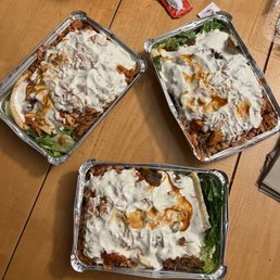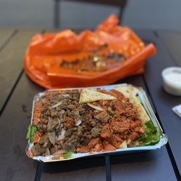 TLDR: Must try if you have the patience and time to wait for this food cart. Protein is packed with flavor, rice is extremely aromatic and they are very generous with their sauce This place has a very loyal audience as I came during a torrential downpour and still had to wait almost an hour for my food. There are two carts but only one line to wait on. You must wait on the main line to order. As you get closer to the front, you can possibly get called to the line for the second cart as it is quicker. The workers know who they called over so don't try to skip as you may end up spending even more time in line when they send you to the back. I ordered a mixed grill (lamb and chicken) over spicy rice with French fries, white sauce and BBQ sauce and a chicken over yellow rice with french fries, white sauce and a splash of red sauce. Everything was perfect. From the protein to rice ratio, sauce amount and flavor. Spicy rice was not spicy at all, it was more aromatic if anything. Chicken is extremely juicy and flavorful. Lamb could have been a little crispier but it did not have the taste that a lot of people dislike. This definitely takes the crown for best halal food in NYC.