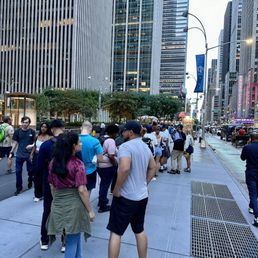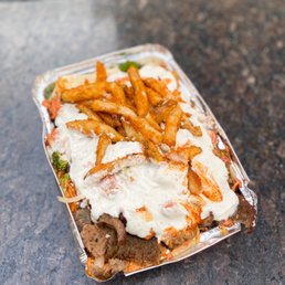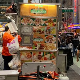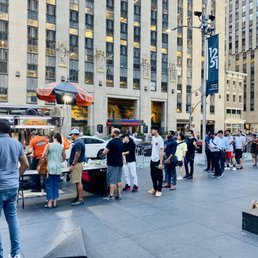 Stopped by after we watched a Broadway show. BOY was the line long. We were half way down the block and waited TWO HOURS. Granted, I've read enough reviews and expected the long wait, but I don't think I would do it again if I had to wait that long next time. I got the mix plate with spicy rice , my bf got the beef with spicy rice and we also got a side order of fries. I normally don't like lamb but you couldn't even taste it. 10/10 better than Halal guys. We did not finish everything and saved it for a late night snack for another night and it still tasted good. People grab their food, and either take it to go or eat close by where there's benches/ tables.