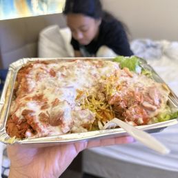 apparently this food truck always has at least a 1hr wait?!? i had to see if it was worth it. and OMG it was SO GOOD. i got lucky because i went right when it opened. but omg are adels' customers LOYAL. it started POURING RAIN, but no one budged in line. maybe like only 5 people left. but that line was still an hour long. lamb and chicken over rice - this was so good. the sauce was flavorful and the meats were so tender. i didn't add fries to mine, but you should definitely add it to yours. it was DELICIOUS. you can choose either regular rice or spicy rice. the spicy rice was not spicy at all. there's also a spicy sauce that's SUPER SPICY. so maybe ask for it on the side.