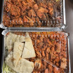 Stumbled upon this place as I was going to a work event. There was a long line on a rainy evening so that I was curious to see what it was all about. It looked pretty interesting and I was surprised to see it wasn't the usual halal guys with yellow umbrellas so I decided to go back post work event. Went back at approx 8:45pm and the line was half of what it was at 6pm. I waited for approx 10 mins until it was my turn. Speaking to regulars on the line, they said this was one of the nights they saw short lines. Perhaps because it was raining. I didn't know what to order as I've never been here before but ended with mixed chicken and lamb over rice and plain chicken, both with spicy rice and sauces on the side. Both were around $22 with tax and tip. Both plates were delicious. The chili is very hot so try a little bit first before tipping the rest in. Literally my mouth was on fire. The food heats up well on the next day too. The place takes both cash and card.